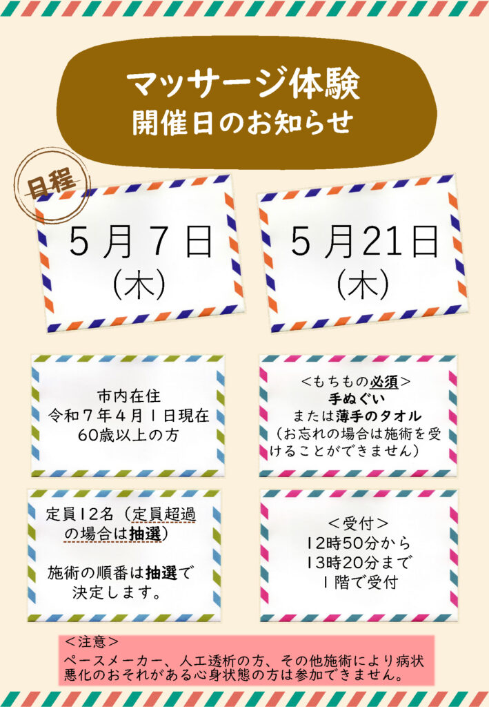 マッサージ体験 令和8年5月日程のお知らせします。
